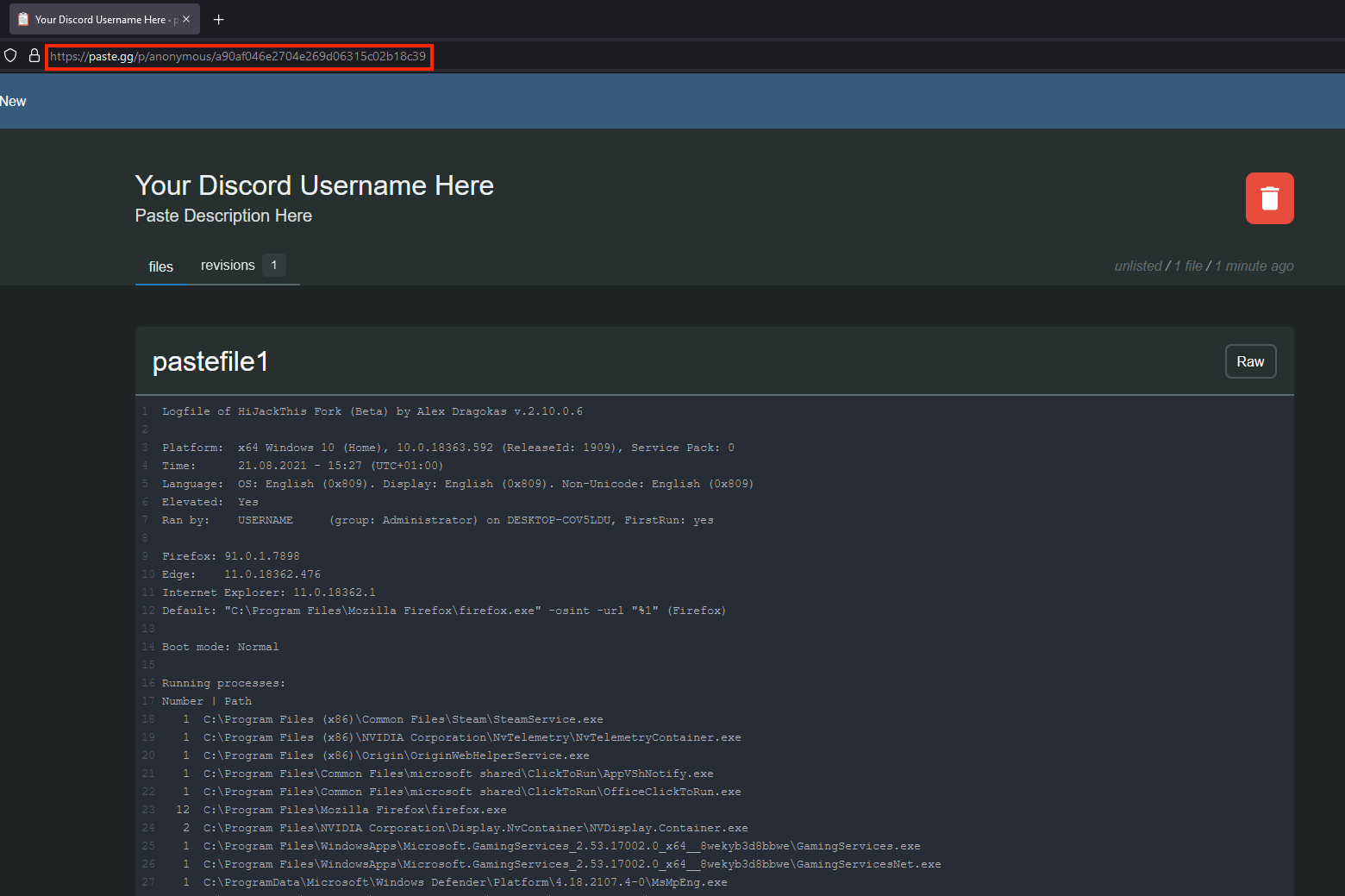 Open https://paste.gg and paste (Ctrl-V or Cmd-V) the contents into the largest field. Put your Discord username into the ‘Paste name’ field, and a description (e.g. ‘HiJackThis report’) in the ‘Description’ field.